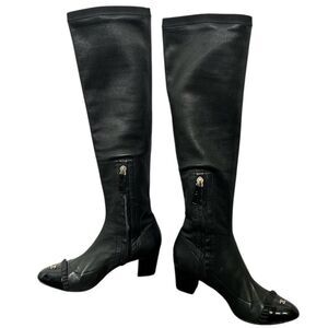 Chanel Black Lambskin Knee-High Boots 2010 Cap Toe Patent Leather CC Logo EU 37