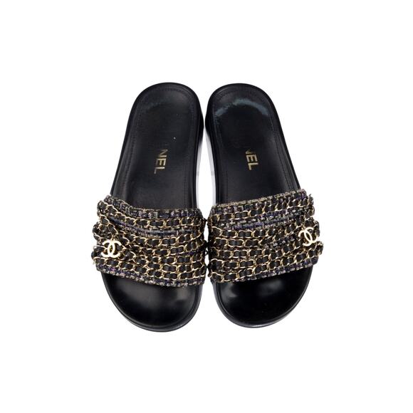Elevate your style with these chic Chanel Black Leather 2016 Interlocking CC Logo Slides. From the Spring/Summer 2016 Collection by Karl Lagerfeld, these slides feature a unique tweed pattern with an interlocking CC logo and chain-link accent. The rubber trim ensures comfort and durability. Includes box for safekeeping.