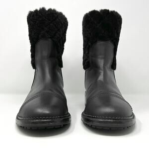 Tough-luxe meets timeless Chanel with these black leather cap-toe boots featuring a plush quilted shearling shaft and subtle back zipper closure. From the iconic G30231 collection, these boots are made in Italy and designed for both cold-weather style and comfort. The tonal CC logo patch at the shaft adds a signature touch, while the lug sole ensures stability in slick conditions.