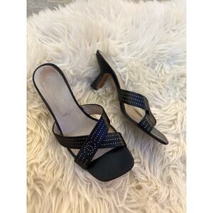 Authentic Chanel black leather slide heels, featuring chic silver-tone stud detailing and classic crisscross straps. Designed with a comfortable low heel and a modern square toe, these versatile mules transition effortlessly from day to night.