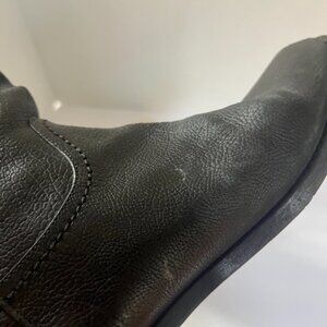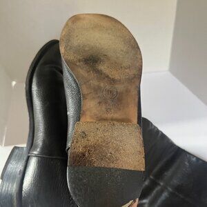Beautiful classic Chanel knee high boots in black leather. Pull on, no zip. Size 38 / US 7.5. The leather is in good shape but the heels need to be resoled. With CC on the backs, small heel.