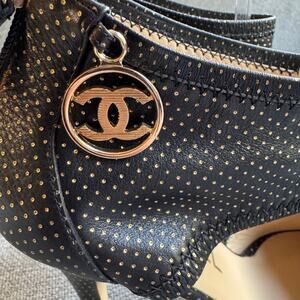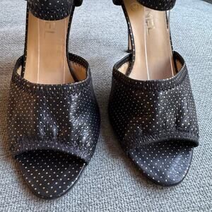 Chanel Black Leather Metallic Polka Dot Peep Toe Sandals Leather Sz 38 US 7.5/8