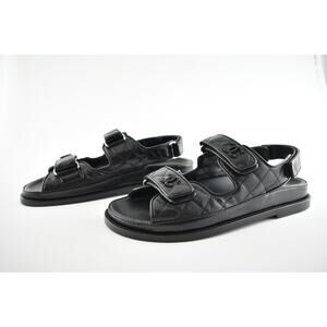 Chanel REV Black Leather Quilted Chain CC Logo Mule Slide Strap Flat Dad Sandal 39.5
