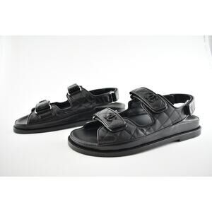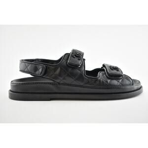 Chanel REV Black Leather Quilted Chain CC Logo Mule Slide Strap Flat Dad Sandal 40