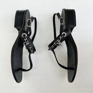 Chanel Black Leather Sandals CC Chain T Strap Ankle Strap Block Heel Shoes 36