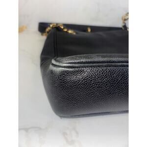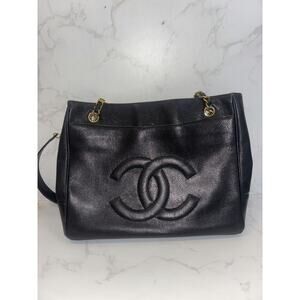 This Chanel tote bag is a timeless piece, perfect for any occasion. The elegant black leather and gold hardware add sophistication to any look. Despite some marks and corner wear, it remains in good condition. Add this iconic Chanel handbag to your collection today!