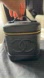 Chanel black leather vanity case with gold zipper. Iconic logo design.