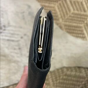 Chic black leather wallet by Chanel. Features a classic design. Caviar calfskin and kiss lock. This is a vintage wallet . Please not any mild imperfections. Has normal vintage wear.hologram in tact .