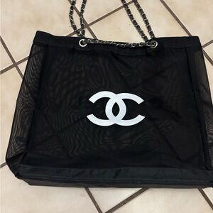 Stylish black mesh tote by Chanel. This was a gift with purchase item! Features iconic logo and chain straps. Ideal for versatile use.