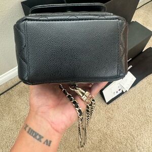 Chanel mini backpack in black quilted design. Features champagne tone logo and hardware. Will come with receipt, bag and box. Can be worn as crossbody or backpack.