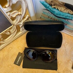 Experience luxury with Chanel's oversized black sunglasses, featuring a chic round frame and a stylish mirrored lens. These sunglasses come with a quilted leather case adorned with the iconic Chanel logo, ensuring both elegance and protection. Perfect for adding a touch of sophistication to any ensemble.