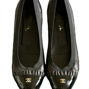Elegant and timeless Chanel black ballet flats with patent leather cap toe and iconic gold CC logo. Size 36 EU / US 6. Gently worn, smoke-free and pet-free home. Authentic designer shoes — perfect for any chic wardrobe.