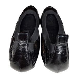 Timeless and iconic, these authentic Chanel ballet flats feature glossy black patent leather with a signature cap toe, stretch trim, and embossed CC logo at the heel. Made in Italy with a rubber-grip sole and a pull-on fit.