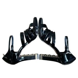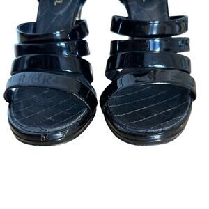 Chanel Black Patent Leather Gold Chain Block Heel Open Toe Sandals