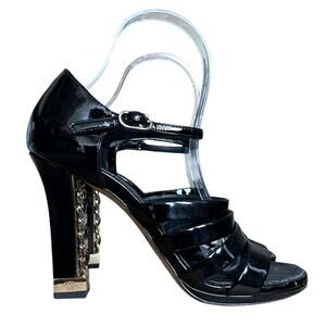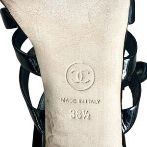 Chanel Black Patent Leather Gold Chain Block Heel Open Toe Sandals 38.5