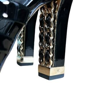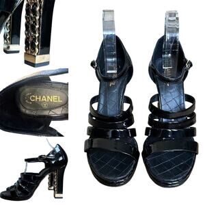Gorgeous and in excellent near new condition, these heels feature a strappy open toe, maryjane tight adjustable strap near ankle and double gold chain and patent leather woven block heel with CC logo. These look super cute underneath a pair of straight of wide leg denim showing the open toe and detailed heel. Leather insole, leather outsole. Very minor peeling near toe of right shoe. Zero flaws to the rest of the patent leather. These are in excellent condition.