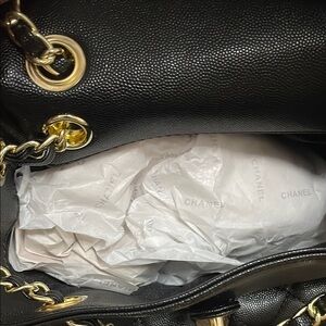 Elevate your style with this elegant Chanel black quilted leather bag. Perfect for any occasion, this bag combines luxury and functionality. Authentic leather black and gold backpack , complementary of Chanel . Comes with dust bag , box and bag. Height 20”cm, width 21cm, depth 10cm, strap drop 70cm.