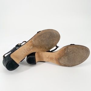 :: designer luxury coco Chanel classic quilted lambskin leather chic chain paper clip link strappy block heels pearl studded gemstone embellished comfortable summer minimalist minimal low heel open toe buckle ::