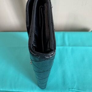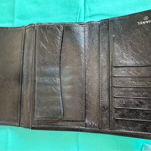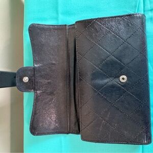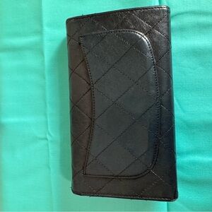 Elegant black quilted leather wallet with a classic design. Perfect for any occasion. SN: 11620545; Size: 4.5x7; Condition very good; Exterior in very good condition; quilting soft and supple; snap is strong; minor signs of use; Interior has no rips or tears, has 6 card slots, several pouches and snap coin pouch; snap is strong; shows some signs of wear.