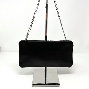 Material + Fit: Soft black satin body with silver tone chain strap that can be worn crossbody, shoulder, or doubled up for clutch styling. Compact yet roomy enough for phone, keys, cards, and small essentials.