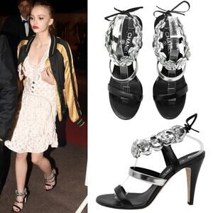 Keywords: Chanel high heels, Camellia ankle strap heels, silver leather sandals, designer evening heels, rare Chanel shoes, luxury stilettos, Karl Lagerfeld Chanel, Spring 2016 Chanel, black silver party heels