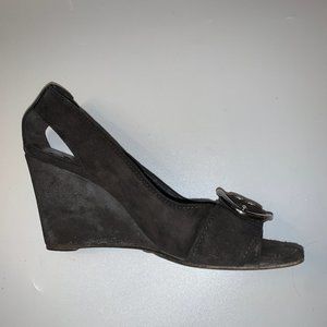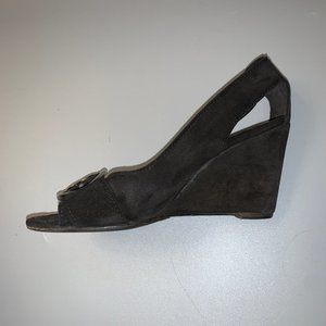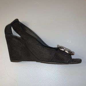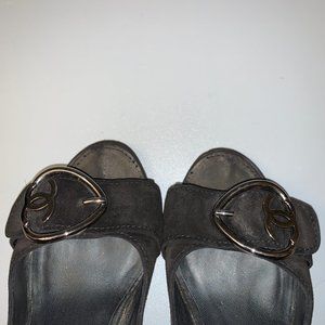 Black suede and leather wedge peep-toe heels with heart CC buckle over the toes