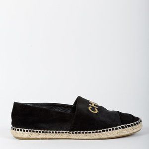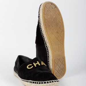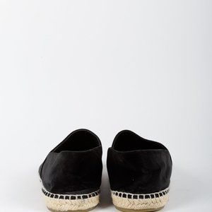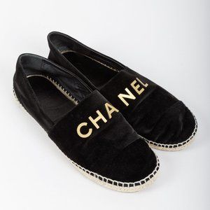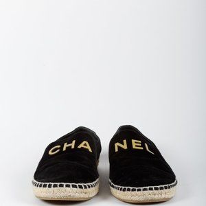 A luxurious pair of Chanel espadrille slip-on flats in black velvet featuring the iconic Chanel name in matte gold-tone at the front, a black toe cap, leather lining, and a natural fibrous textile midsole reinforced with a rubber sole for a casual yet timeless look.