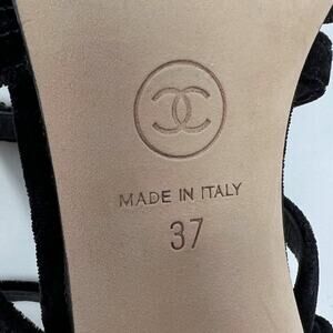 Chanel black sandals, Cruise Collection shoes, velvet Chanel heels, strappy buckle sandals, vintage Chanel heels, Chanel size 37, G32406, rare Chanel shoes, collectible Chanel runway, patent leather heel, designer black evening sandals, gala heels, cocktail party shoes, made in Italy, rare shoes, karl Lagerfeld Era.
