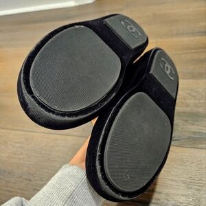 Single outerside stitched Double C Chanel logo. Serial number inside shoe tongue.