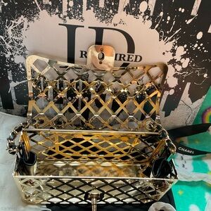 This elegant Chanel clutch features a luxurious black and gold color scheme, highlighted by a distinctive lattice design. Perfect for upscale events, it combines style and functionality with its compact form and wristlet option. The clutch's sophisticated design makes it a timeless accessory for any occasion.