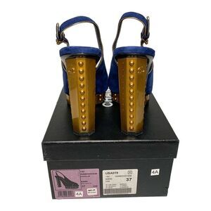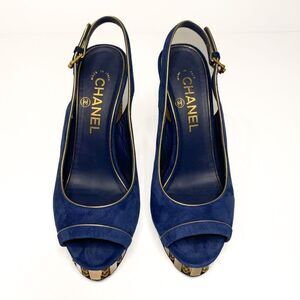 Chanel Blue Suede Gold Studded Interlocking C Slingback Heels EU 37 US 6-6.5