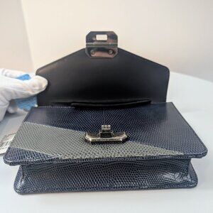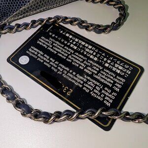 This unique Chanel structured mini bag with top handle is crafted from authentic lizard skin in a patchwork design. The bag has a top flap closure secured by a sleek ruthenium-tone (dark silver) rectangular turn-lock, engraved with "CHANEL PARIS." The matching large-link ruthenium chain can be used for hand-carry and the ruthenium and navy leather strap for shoulder or crossbody wear. The interior is lined with black leather. This bag is in excellent/like new condition and comes as a full set—with card, box, dust bag, Chanel ribbon, and the original $10,700 price tag. The bag is from the 22 series (2022).