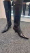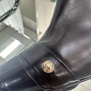 Brown leather, pointed toe, interior zip, kitten heel, gold-tone hardware, engraved logo stud on exterior toe and matching toggle