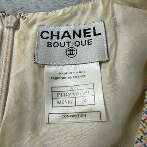 Chanel Boutique Women's Size Small US/36 EU 62% Wool and 38% Silk Tweed Dress in good pre owned condition as shown in the photos with the only flaws being staining around the neck area as well as the inside bottom of the dress has some staining as shown in the photos. Nothing noticeable.