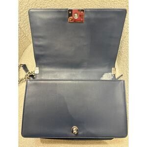 Authentic Chanel Boy Bag in the medium size, crafted from navy blue perforated calfskin leather with silver-tone hardware. This stylish and structured bag features the iconic quilted design, signature CC push-lock closure, and adjustable chain-link strap with leather shoulder support for versatile wear. The interior is lined with beige fabric and includes a zippered pocket and slip pockets for organization.