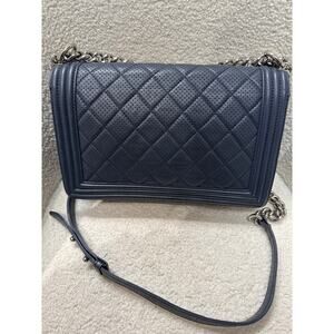 Chanel Boy Bag Medium Perforated Navy Blue Calfskin Leather with Silver Hardware