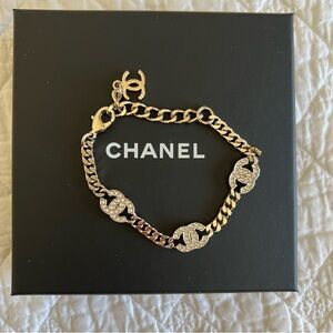 Chanel bracelet in light gold with crystals from the 21A collection. In excellent condition- comes with original box and dust pouch.