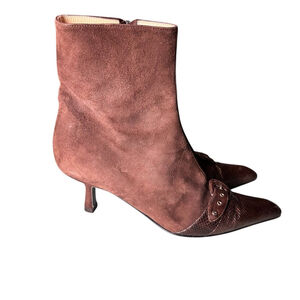 Chanel Brown Suede Kitten Heel Ankle Boot Snake Embossed Leather 38 Pointed Toe