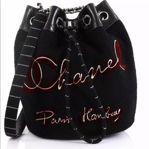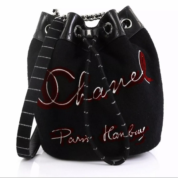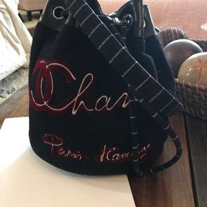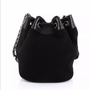 Gorgeous authentic Chanel bucket bag. Preloved in great condition. Soft black wool with lamb skin bottom. No stains. Dress up or with jeans. Comes with the card and dust bag. No trades