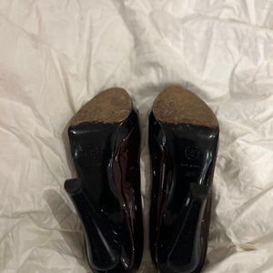 Authentic Chanel burgundy and navy patent leather heels with classic Chanel logo - chic and go with everything. The cut out heel is a fun and unexpected touch.