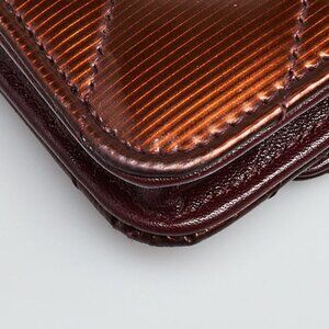 The exterior patent leather has faded from its original dark red/burgundy color. It has a more brown/red hue. There is some wear to the corner edges and a black transfer mark on the back. The hardware is bright and shiny with surface scratches. The interior has scuffing and signs of use but overall remains in good condition.