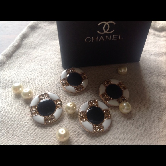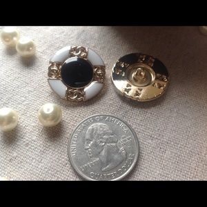 Black and white with gold CC Chanel buttons. Made of metal and the size of a quarter. Sold in quantity of 4.