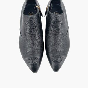 These Chanel western ankle booties feature black textured leather uppers with pointed cap toes detailed by CC logo stitching. Designed with side zip closures, leather lining, and low heels, they’re finished with professionally-installed rubber outsoles for improved grip and longevity.