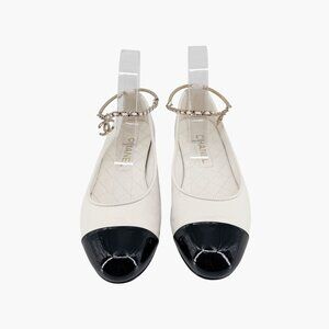 Chanel CC Camellia Ankle Chain White Cap Toe Ballet Flats Size 37.5 US 6.5-7