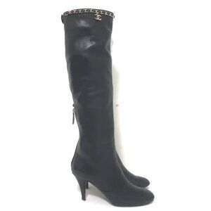 Chanel CC Chain-Trim Cap Toe Knee High Boots Black Leather Size 36.5