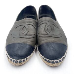 Chanel CC Espadrille Flat Gray Suede Leather Cap Toe Slip On Sz 37 / 7