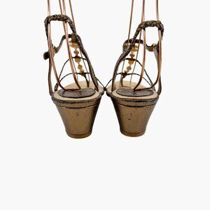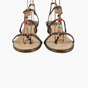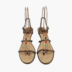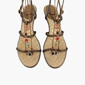 These Chanel wedge sandals feature metallic gold quilted leather footbeds, bronze braided leather straps, and a T-strap design accented with a chain, CC logo, and multicolored gems. Finished with a low wedge heel and adjustable ankle strap, they add a luxe, statement-making touch to summer dresses, resort wear, or evening ensembles.