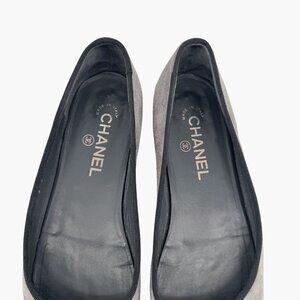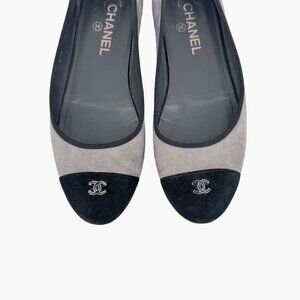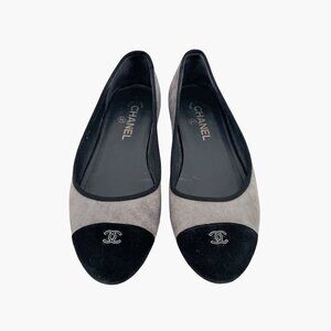 Chanel CC Gray Suede Black Cap Toe Ballet Flats Shoes Size 39 US 8-8.5 Logo