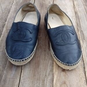 Stunning Chanel black lambskin leather truly timeless and classy summer espadrilles. Retail $950. Chanel Size 38. Great to have two pairs but we’re moving! Priced to sell ASAP.