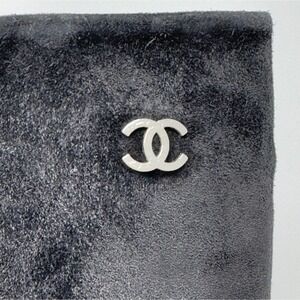 -These Chanel knee-high boots are a must-have for any fashion-forward woman. Made from black suede, they feature the iconic CC logo on each side and a pointed toe for a sleek, sophisticated look.